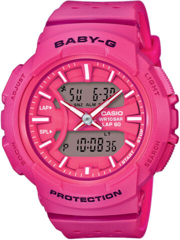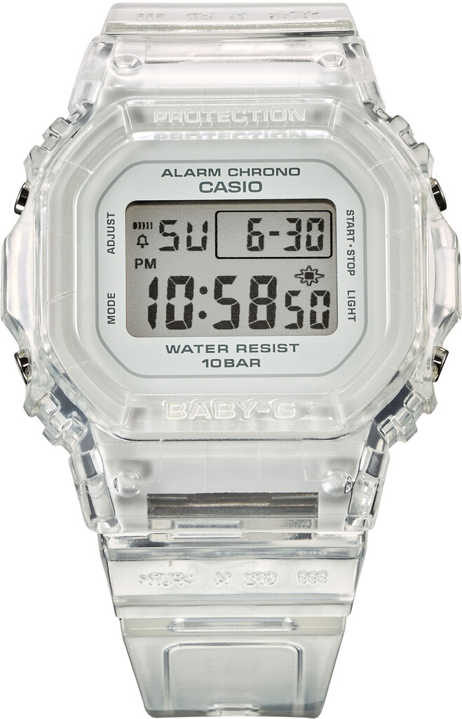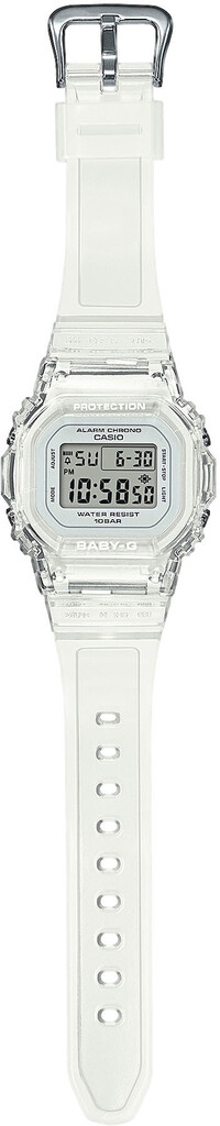 Корпус і браслет виготовлені з полімерного прозорого матеріалу. Світлий дисплей. Ударостійка конструкція захищає механізм від ударів і вібрації. Секундомір рахує з точністю до 1/100 секунди, межа вимірювання – 24 години. Таймер зворотного відліку від 1 хвилини до 24 годин, з автоматичним повтором. Присутні LED індикатор – світлодіодна лампочка починає блимати під час спрацьовування будильника, після закінчення таймера зворотного відліку або секундоміра. Багатофункціональні будильники мають на увазі під собою: щоденний сигнал, звучить в один і той самий час кожен день, датований будильник, тобто сигнал, що допомагає Вам згадати, наприклад, про день народження, щомісячний будильник, звучить в один і той самий день кожен місяць, будильник для кожного дня певного місяця. Акумулятор розрахована на 3 роки. Застібка ремінця – пряжка.