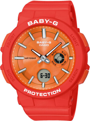 CASIO BSA-B100-1AER – це годинник з функцією крокоміра, що дає змогу відстежувати активність протягом дня. Так само в годиннику є Bluetooth, завдяки якому годинник синхронізується з телефоном. Якщо активності довгий час немає, годинник починає видавати звуковий сигнал. Такий годинник стане чудовим подарунком для активних дівчат. Годинник має водозахист, що дає змогу купатися в годиннику і займатися активними видами спорту, адже цьому сприяє і протиударна конструкція корпусу. У цій моделі є всі функції Baby-G. Якщо ви віддаєте перевагу надійності і цінуєте практичні аксесуари, то вам слід звернути вашу увагу на Casio BSA-B100-1AER.