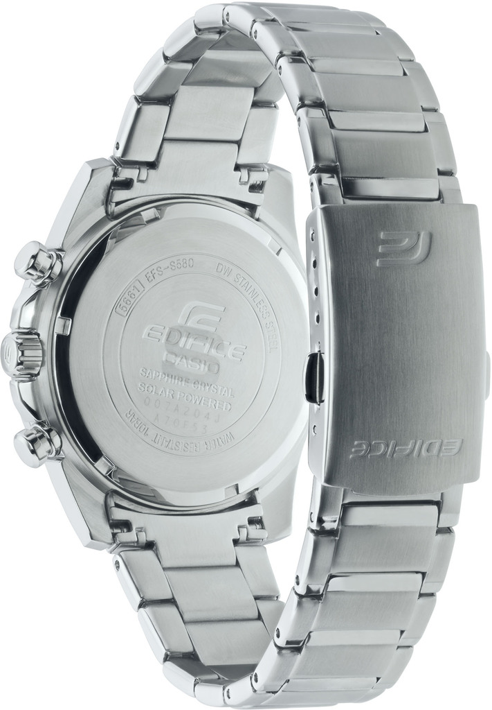 Японський годинник у спортивному стилі CASIO EFS-S580D-1AVUEF ідеально підійде для повсякденного і спортивного чоловічого образу. Корпус і браслет виконані з високоякісної нержавіючої сталі. Колір циферблата – чорний, з вуглецевого волокна. Індикація – мітки. Стрілки та мітки з покриттям необрит, яке забезпечує тривале світіння в темряві. Сонячна батарея забезпечує живлення годинника. Без підзарядки, при повному заряді акумулятора, годинник працює до 6 місяців. Термін служби батареї приблизно 25 років. Присутній індикатор, що сповіщає про рівень заряду акумулятора. Функція секундоміра – 1 сек. – 10 хвилин. Браслет моделі має особливу безпечну запобіжну засувку, яка запобігає його випадковому розстібанню.