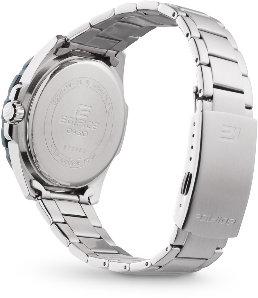 Цей годинник стане прекрасним доповненням Вашого вбрання. Модель EFV-120DB-2AVUEF від бренду CASIO з колекції EDIFICE являє собою вишуканий годинник з глибоким синім циферблатом. Корпус і браслет із неіржавкої сталі з подвійним фіксатором застібки для запобігання випадкового відкриття браслета. Безель покритий “процесом іонного покриття” для підвищеної стійкості до подряпин, а також рамка зворотного відліку. Мінеральне скло міцне і стійке до подряпин. Водонепроникність 10 Бар дає можливість плавати з маскою і трубкою. На дисплеї відображаються годинникова, хвилинна і секундна стрілки, а також індикація поточної дати. Цей годинник – ідеальний варіант для шанувальників активного способу життя і класичного стилю.