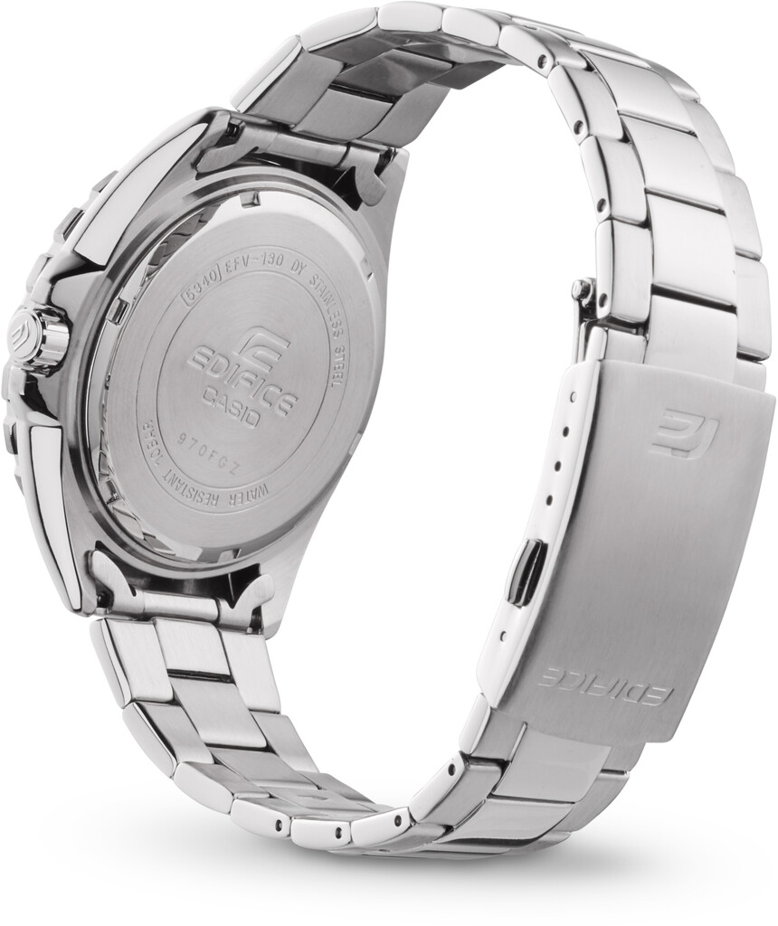 Колекція Edifice від CASIO EFV-130D-1AVUE пропонує ідеальне поєднання класичного та спортивного стилю. Надійний кварцовий японський механізм дозволяє використовувати годинник як молодим людям, так і представникам старшого покоління. Нержавіюча сталь і мінеральне скло надають практичності моделі. Циферблат, що добре читається, та індекси, які блищать у темряві, дають змогу завжди бути в курсі часу. А водозахист 100 метрів робить CASIO EFV-130D-1AVUE ідеальним вибором для щоденного носіння. Поєднання сталевого і чорного кольору робить цей годинник гарним доповненням до будь-якого образу, чи то ділова зустріч, чи то літній відпочинок.