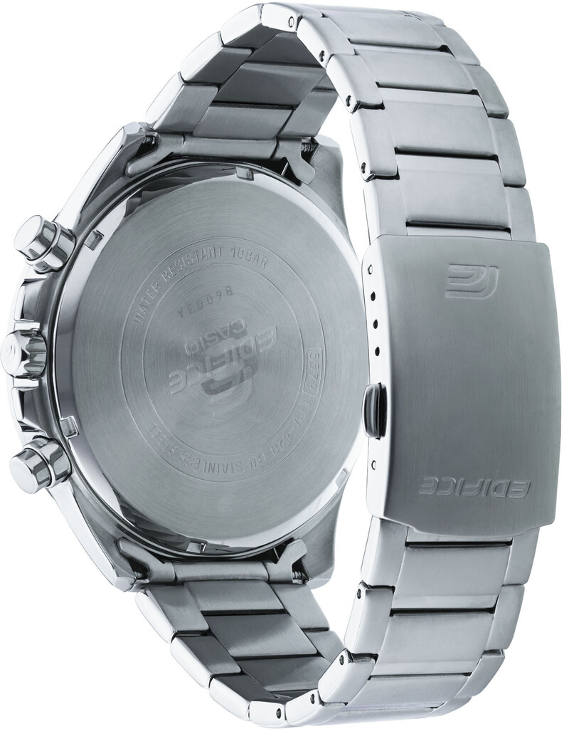 Годинник Edifice від компанії Casio поєднує в собі позачасову елегантність з яскравим спортивним дизайном. Піддайтеся їхній чарівності та придбайте цю модель у свою колекцію. Чорний циферблат з індексами привертає увагу трьома додатковими циферблатами з функцією секундоміра. Мінеральне скло захищає циферблат і механізм. Корпус і браслет виготовлені з першокласної нержавіючої сталі. Вам також сподобається водонепроникність 10 АТМ, завдяки якій ви можете плавати з годинником.