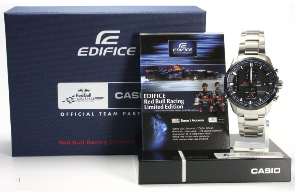 Модель чоловічого годинника EQW-A1110RB-1A колекції Casio Wave Ceptor має корпус круглої форми виконаний з нержавіючої сталі з PVD, з циферблатом чорного кольору та індексами захищеним мінеральним склом. Сталевий браслет, кварцовий механізм. Додаткові функції: Red Bull Racing Limited Edition, Повністю автоматичний календар, Світовий час, 12/24 годинний формат часу, Секундомір, Звуковий сигнал, Попередження про розряджену батарею, Прийом радіосигналу, Сонячний елемент живлення. У цьому годиннику можна плавати і пірнати на невелику глибину до 3-5 метрів.