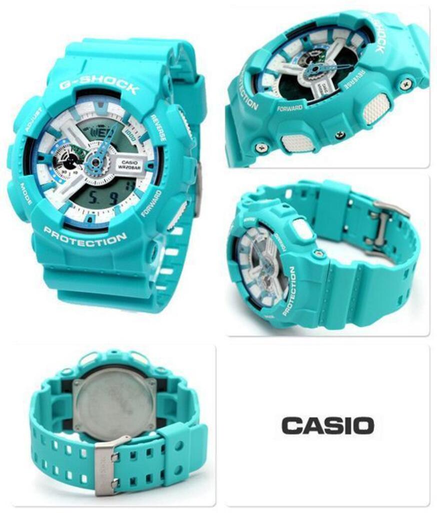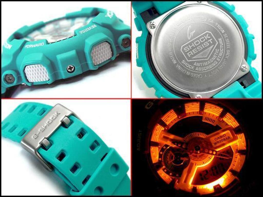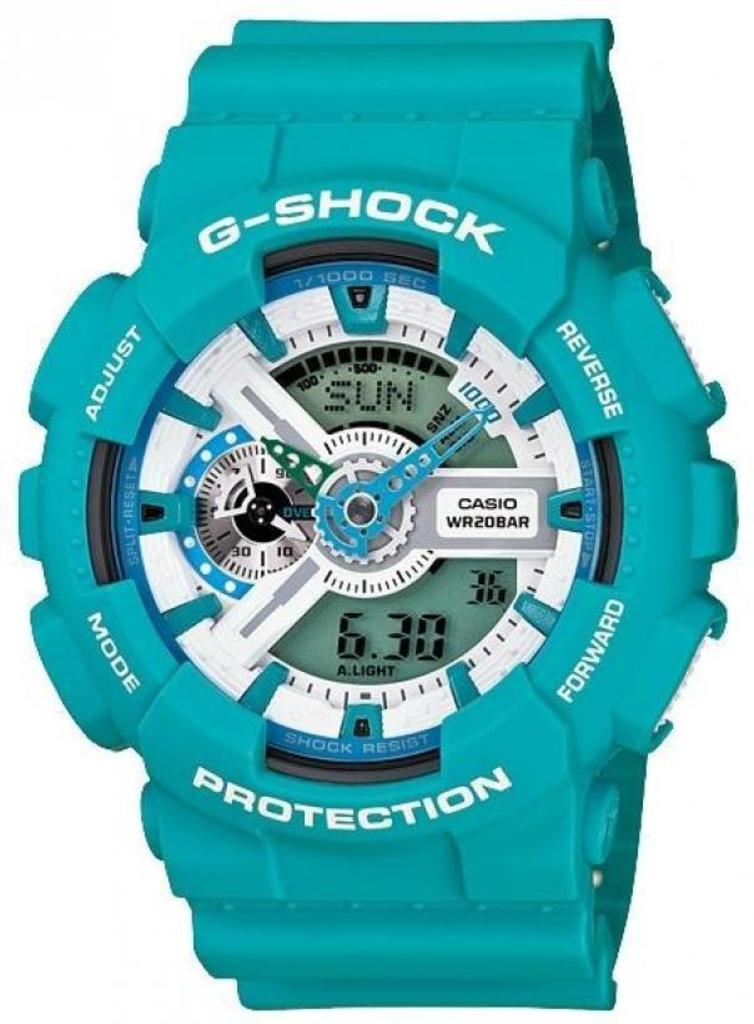Модель чоловічого годинника GA-110SN-3A колекції Casio G-Shock має корпус круглої форми виконаний з полімеру, з циферблатом білого кольору та електронними цифрами та індексами захищеним мінеральним склом. Пластиковий ремінець блакитного кольору, кварцовий + електронні механізми. Додаткові функції: Удароміцні, Повністю автоматичний календар, Світовий час, 12/24 годинний формат часу, Світлодіодне авто-підсвічування, Секундомір, Таймер зворотного відліку, Будильник, Функція повтору сигналу, Магнітостійкі. Ця модель годинника підходить для дайвінгу.