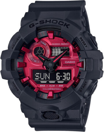 Колекція CASIO G-Shock – широкий функціонал, ударостійкий корпус, спортивний дизайн і доступна вартість. У годиннику з японським кварцовим механізмом є будильник, таймер, секундомір, показ часу іншого часового поясу та автоматичний календар. Підсвічування забезпечує хорошу видимість циферблата з подвійною індикацією в темряві. Протиударний пластиковий корпус не пропускає вологу, за водостійкості 200 WR з годинником можна плавати і занурюватися з аквалангом. На дисплеї, закритому мінеральним склом, відображається час, дата, день тижня і місяць. Годинник CASIO GA-700PC-1AER фіксується на руці полімерним ремінцем.