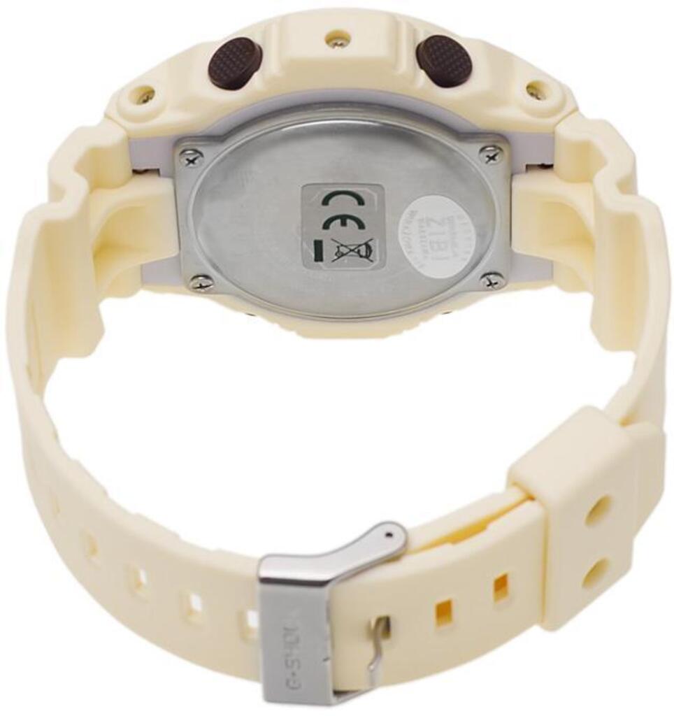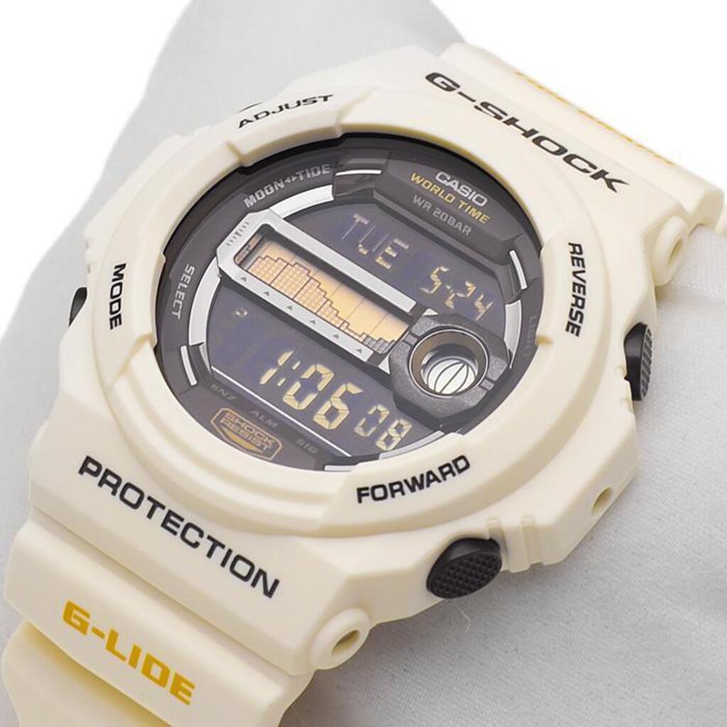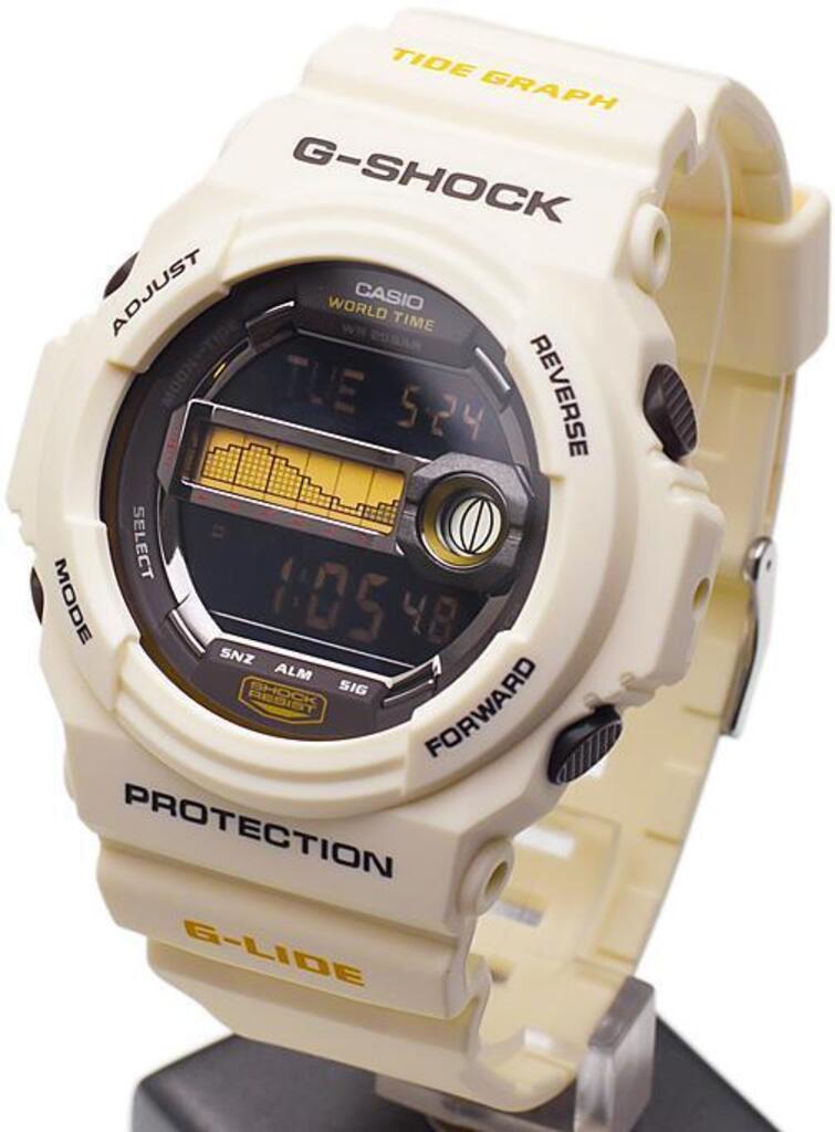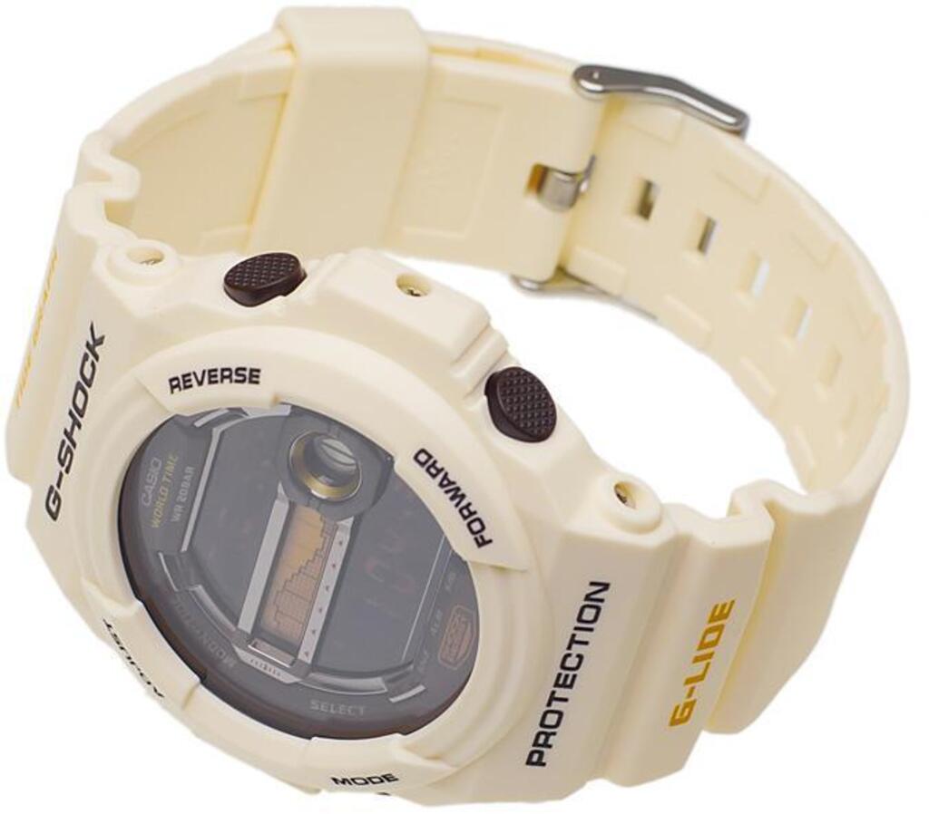 Модель унісекс годинника GLX-150-7E колекції Casio G-Shock має корпус круглої форми виконаний з полімеру, з циферблатом чорного кольору та електронними цифрами захищеним мінеральним склом. Пластиковий ремінець бежевого кольору, електронний механізм. Додаткові функції: Удароміцні, Повністю автоматичний календар, Місячний календар, Світовий час, 12/24 годинний формат часу, Відображення таблиці припливів та відливів, Світлодіодне авто-підсвічування, Секундомір, Таймер зворотного відліку, Будильник, Функція повтору сигналу, Увімкнення/вимкнення звуку. Ця модель годинника підходить для дайвінгу.