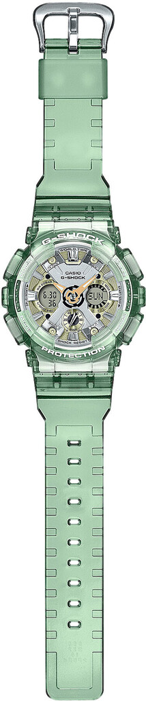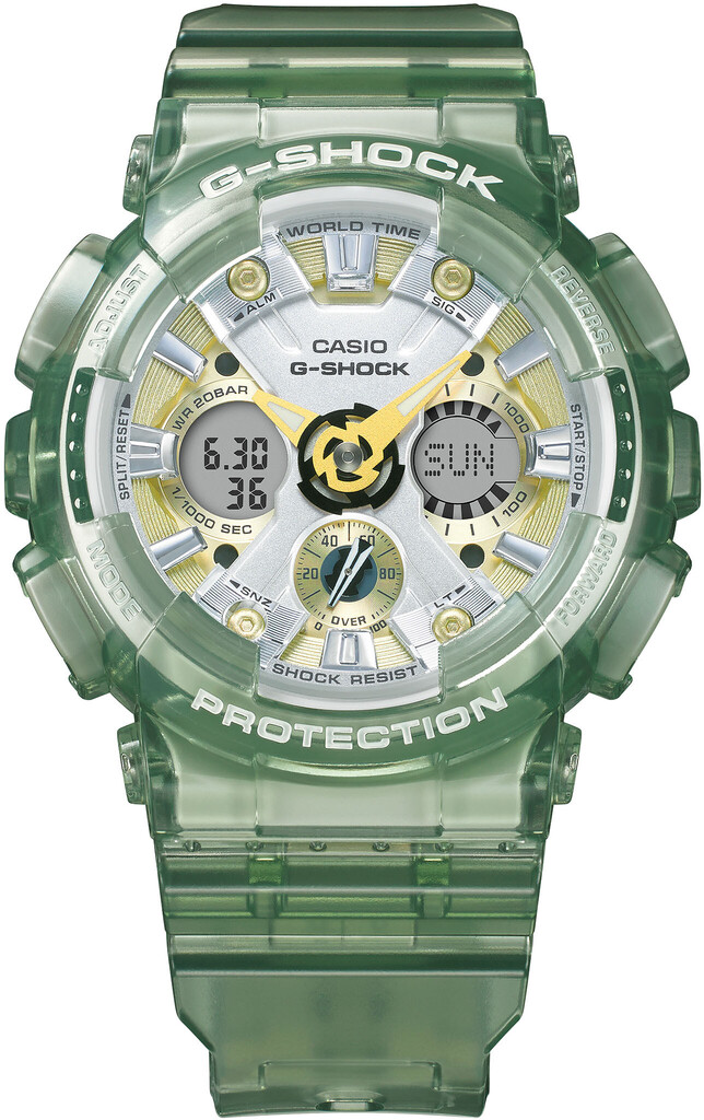 Чоловічий годинник CASIO G-Shock з полімеру з кварцовим механізмом і мінеральним склом. Прозорий корпус у формі кола захищений від води на 200 WR. Він оснащений аналогово-цифровим циферблатом і розширеним функціоналом: будильник, секундомір, протиударні, другий час, підсвічування, індикація дня тижня, таймер, автоматичний календар і індикація місяця. Гарантія 24 місяці.