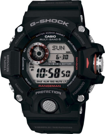 Перед вами модель кольору хакі із преміальної серії G-Shock RANGEMAN. Окрім чудового брутального дизайну – це одна з найміцніших і функціональних цифрових моделей у всьому сімействі G-Shock. На борту моделі ви знайдете: вічне джерело живлення у вигляді сонячної батареї, потрійний датчик (Triple Sensor): вимірювання тиску та температури повітря, цифровий компас і висотомір, відображення сходу та заходу Сонця, радіо-синхронізація часу з атомним годинником на різних континентах, легендарна джишокова стійкість до ударів, водозахист в 200 метрів і ще більше 10 функцій.