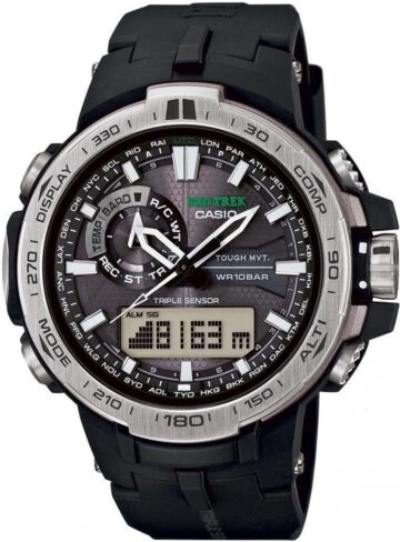Ця спортивна модель комбінованого годинника CASIO PRT-B50YT-1ER представлена в пластиковому корпусі з металевою задньою кришкою і титановому браслеті з розкладною кнопковою застібкою. Безель потужний, рифлений. Колір моделі – чорний. Годинник оснащений кварцовим механізмом. Морозостійкі. Модель представлена у вугільно-чорному кольорі. Чорний змішаний циферблат перебуває під захистом мінерального скла. Водостійкість 100 м. Тип індикації – люмінесцентні арабські цифри, індекси та стрілки. Цю модель оснащено функціями: електронне підсвічування, 5 будильників, секундомір, таймер, день тижня, число місяця, місяць року, світовий час (38 часових зон), компас, альтиметр (висотомір) від -700 до 10000м, термометр, від -10 до 60 °C, барометр від 260 до 1100 гПа, Bluetooth, крокомір, пошук телефону.