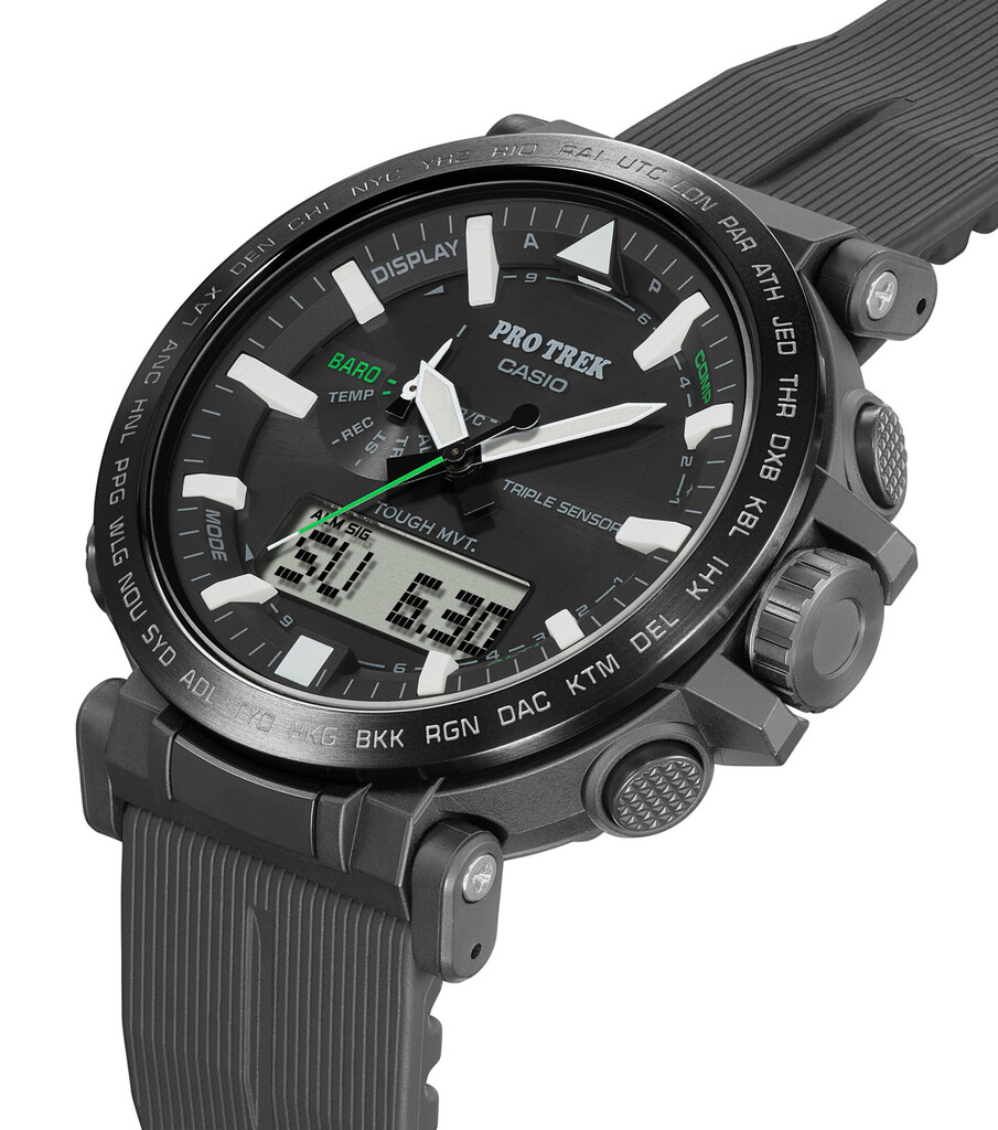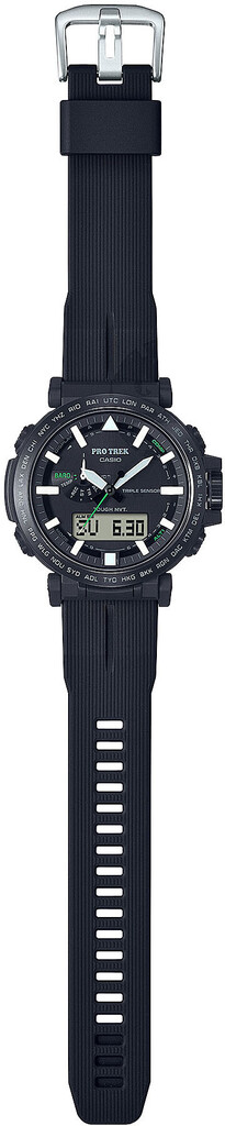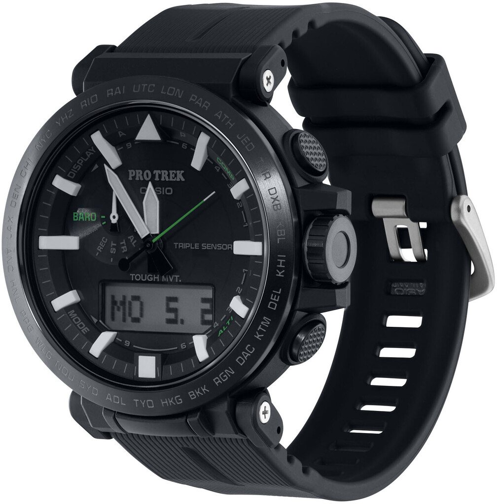 Чоловічий годинник CASIO Pro Trek з кварцовим механізмом і полімерним корпусом у військовому стилі має мінеральне скло, водостійкість 100 WR, чорний циферблат з аналоговою і цифровою індикацією, підсвічування і багатофункціональні можливості. Гарантія 24 місяці.
