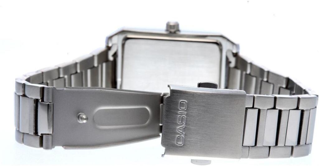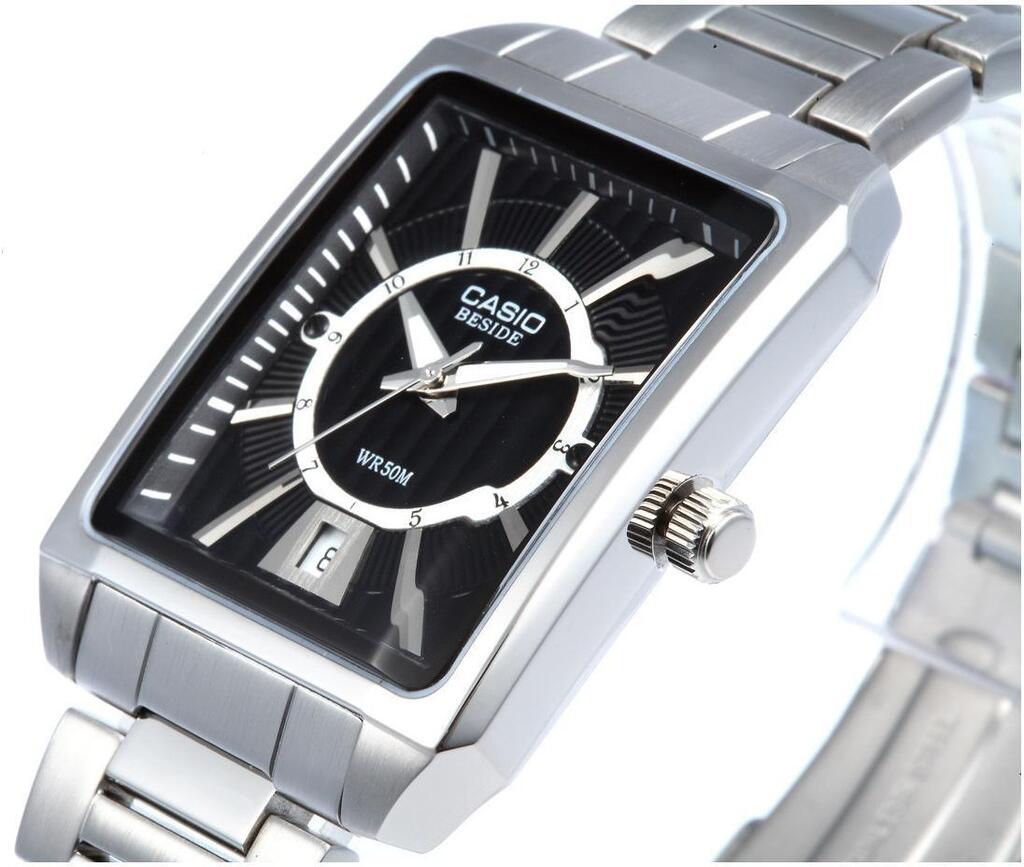 Модель чоловічого годинника BEM-120D-1A колекції Casio Beside має корпус прямокутної форми виконаний з нержавіючої сталі, з циферблатом чорного кольору та арабськими цифрами та індексами захищеним мінеральним склом. Сталевий браслет, кварцовий механізм. А додаткова функція дати надає зручності. У цьому годиннику можна плавати, але не пірнати глибше 3 метрів.