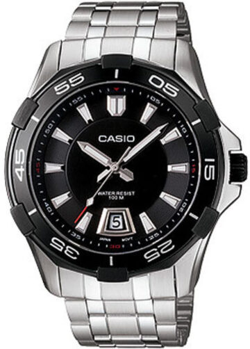 Модель чоловічого годинника MTP-1169D-1A колекції Casio Standart Analogue має корпус “бочкової” форми виконаний з нержавіючої сталі, з циферблатом чорного кольору та індексами захищеним мінеральним склом. Сталевий браслет, кварцовий механізм. Годинник захищений від бризок, зокрема від дощу, але занурювати у воду його не можна.