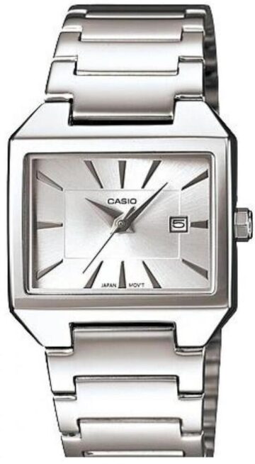 Жіноча модель у повсякденному класичному стилі з колекції Casio. Прямокутний корпус та ланцюжок із нержавіючої сталі, мінеральне скло, чорний аналоговий дисплей із вказівником дати. Водонепроникність 3 АТМ.