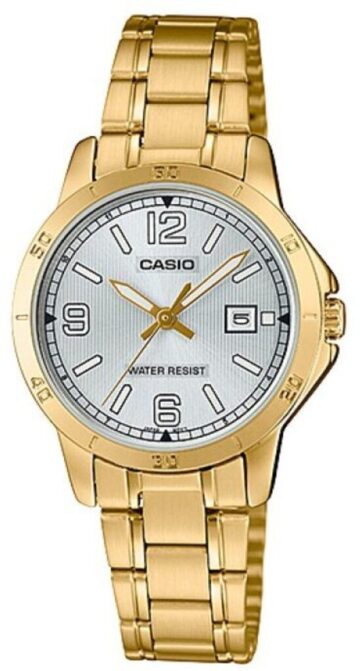Ось рерайт: Цей позолочений металевий ремінець додасть Вашому образу індивідуальність. Круглий циферблат із чорним тлом чудово поєднується з індикатором дати в положенні “3 години”. Батарея SR626SW надає приблизний термін служби протягом 3 років, а ударостійке мінеральне скло забезпечить довговічність.