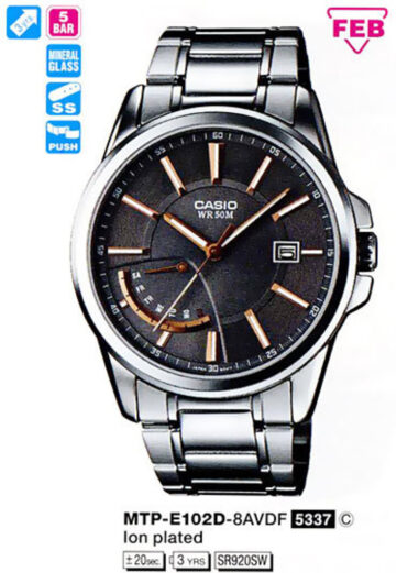 Casio LTP-V300D-2A2 – це кварцовий годинник з круглим корпусом з латуні з хромовим покриттям сріблястого кольору. Аналоговий циферблат чорного кольору вирізняється індикацією у вигляді міток, римських цифр, дати, дня тижня і часу доби. Стійке мінеральне скло і нержавіючий браслет з класичною застібкою-кліпсою забезпечують високу міцність годинника. Високий рівень водонепроникності – 30 WR – дає змогу використовувати годинник навіть під час дощу.