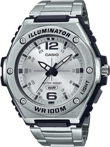 Елегантний і надійний чоловічий годинник CASIO MWA-100HD-2AVEF з кварцовим механізмом, нержавіючим корпусом і браслетом, а також синім циферблатом з арабськими цифрами та індексами. Він має водозахист 100 WR і гарантію 24 місяці.